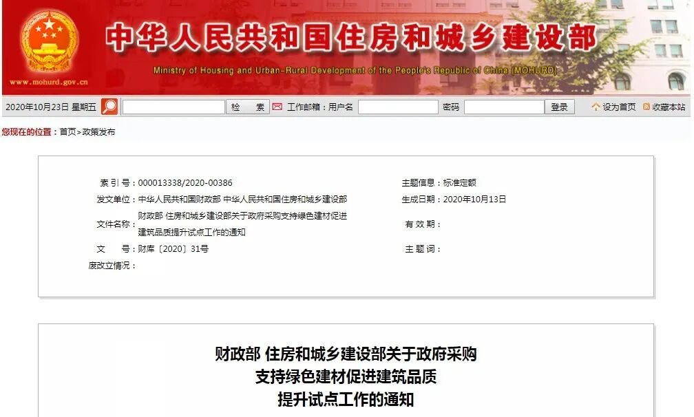10月21日,财政部和住房和城乡建设部联合印发《关于政府采购支持绿色建材促进建筑品质提升试点工作》的通知,试点基本原则是选择一批绿色发展基础较好的城市,在政府采购工程中探索支持绿色建筑和绿色建材推广应用的有效模式,形成可复制、可推广的经验,试点城市为南京市、杭州市、绍兴市、湖州市、青岛市、佛山市。鼓励其他地区按照本通知要求,积极推广绿色建筑和绿色建材应用。